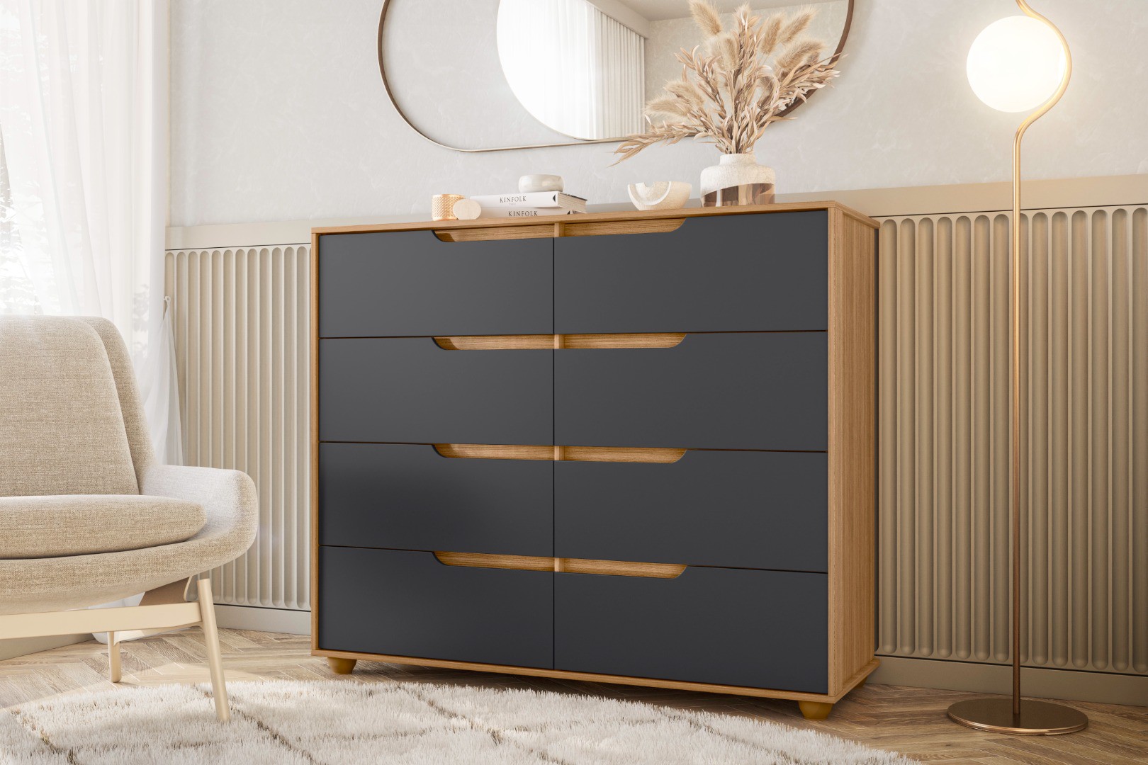 Puxadores Cava. Moldura em 15 mm. Reforço estrutural no fundo das gavetas. Pés inclusos. Interna 100% na cor do produto.