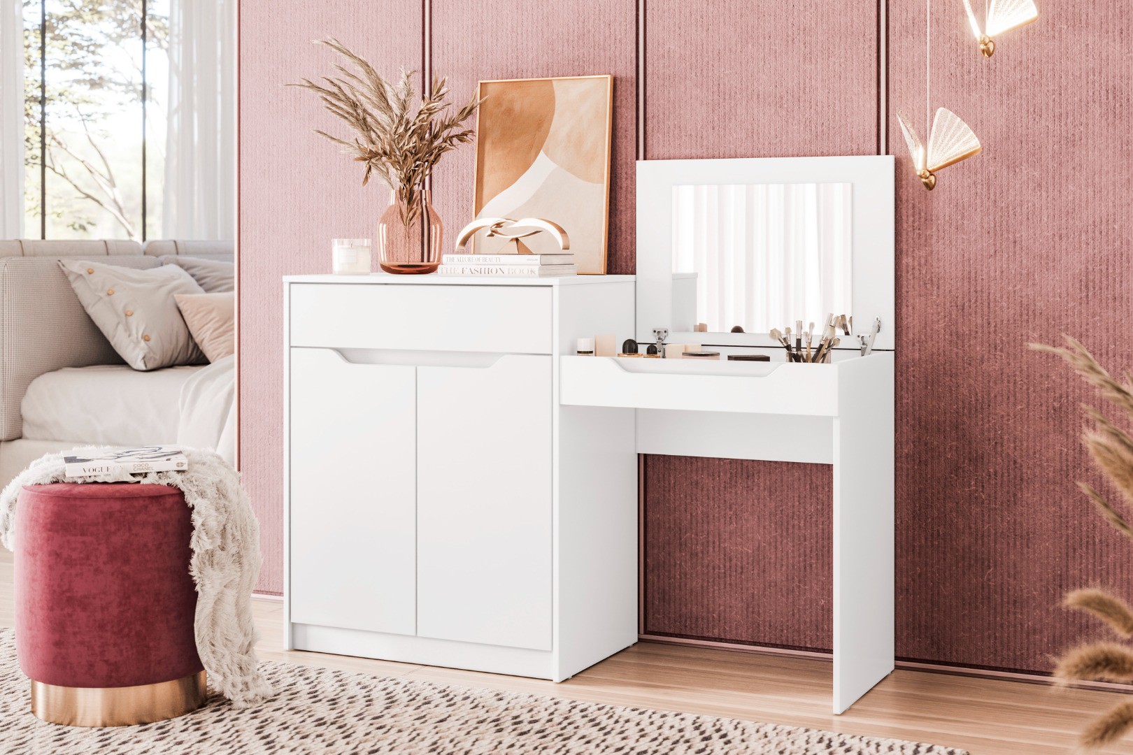 Tampo basculante com pistão a gás e divisórias organizacionais internas. 1 gaveta com corrediça telescópica. Puxadores cava. Adequado à ergonomia. Interna 100% na cor do produto. Espelho incluso 0,45x0,36 m - parafusados no tampo.